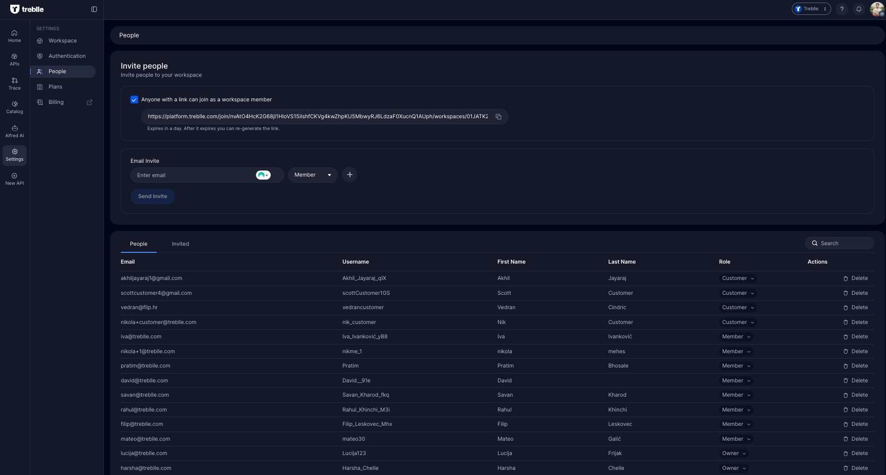- Invite users via email or an invite link (link expires in 24 hours and can be regenerated anytime).