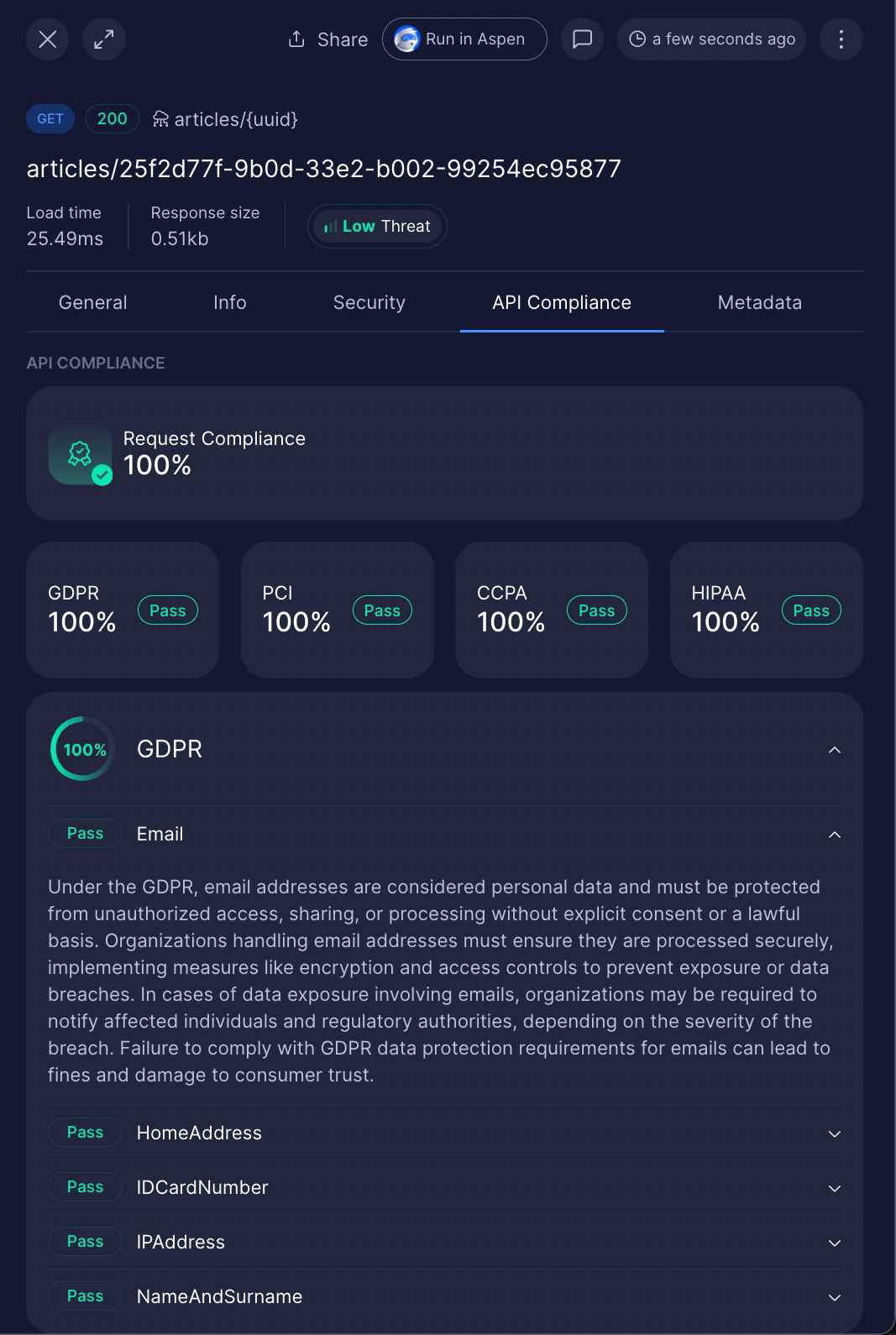The API Compliance feature helps you ensure your API adheres to regulatory requirements such as GDPR, CCPA, and PCI DSS by identifying sensitive data within API requests and responses.
