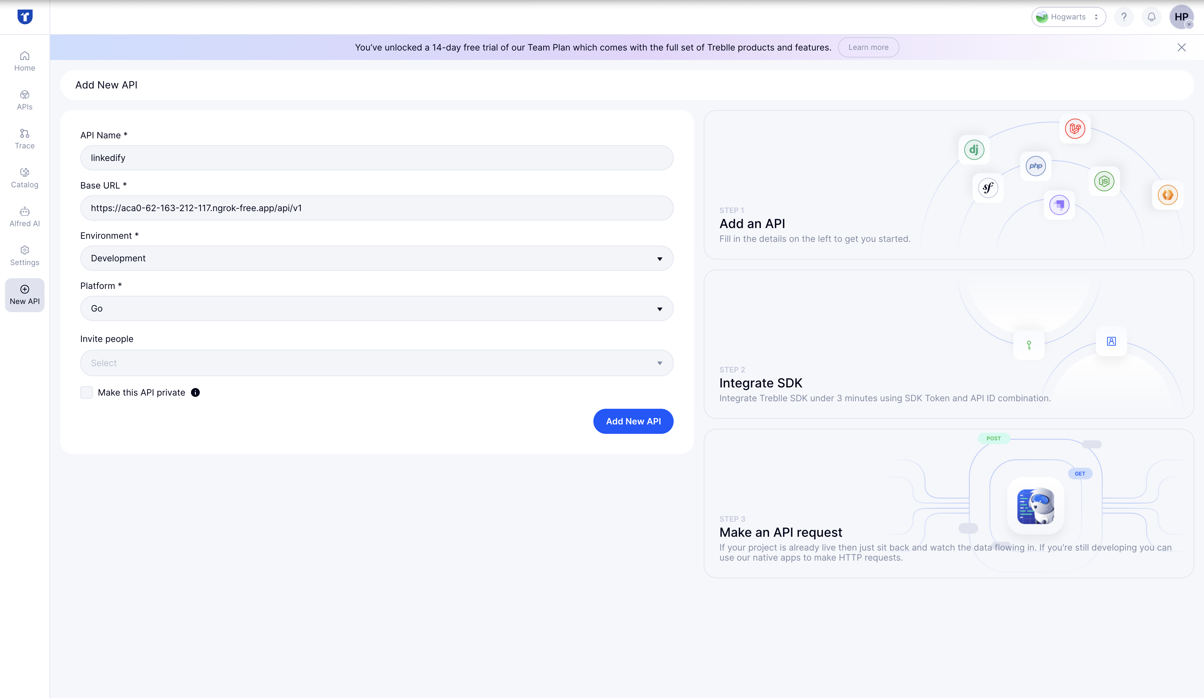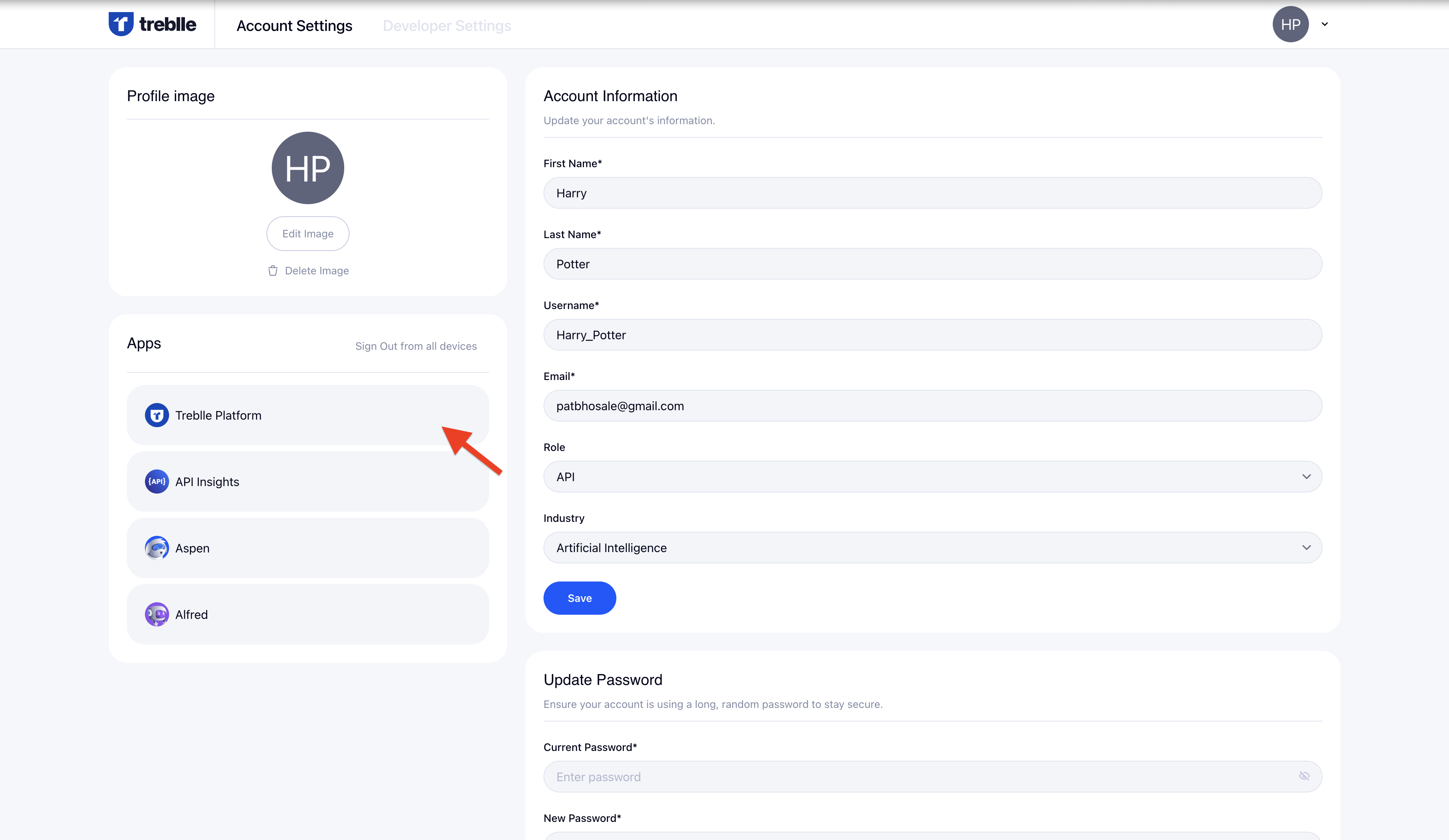 After logging in, you’ll enter your Treblle account settings page. Click on the Treblle Platform button from the Apps section.