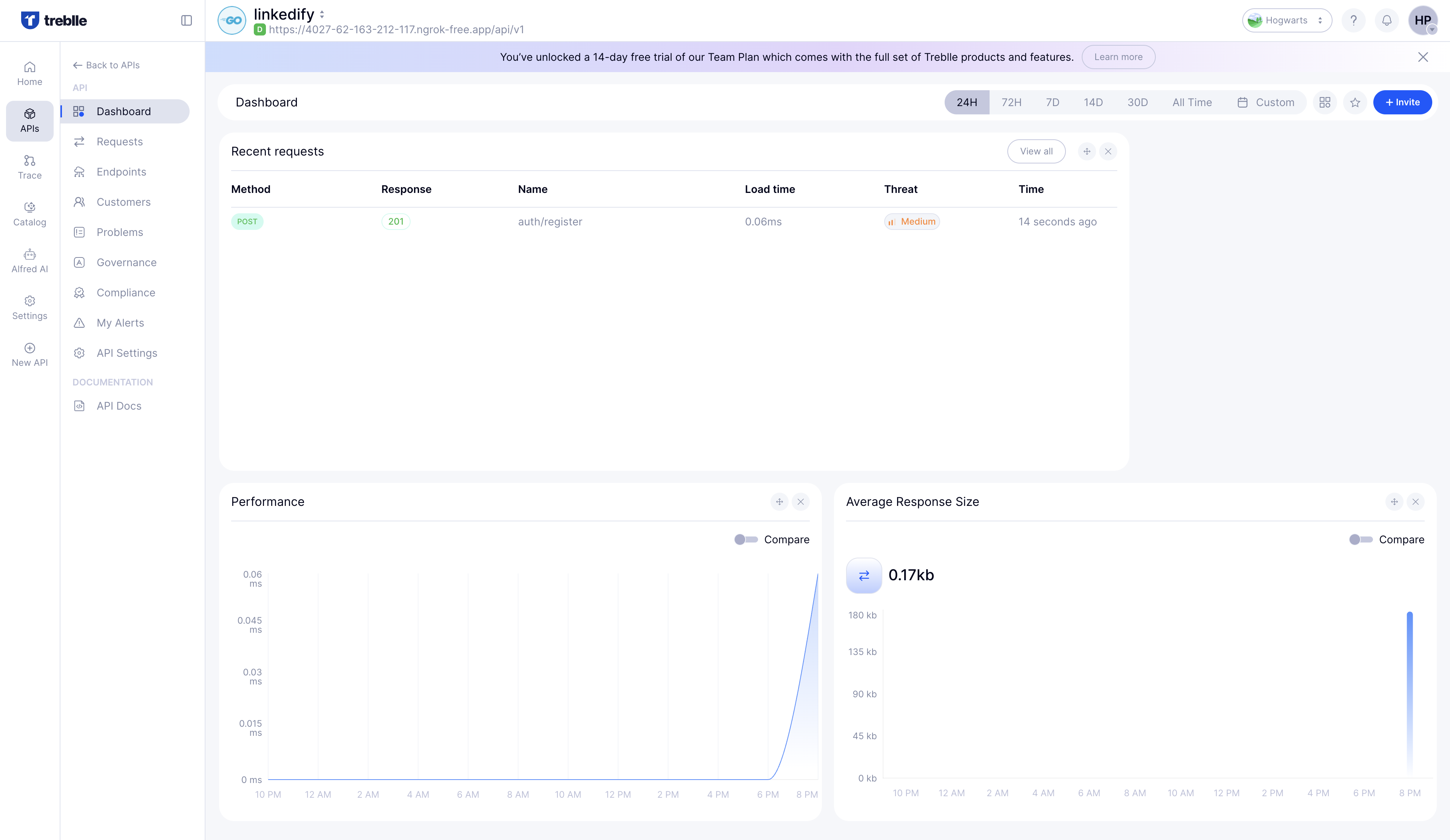 Section titled “Observing your first API request in Treblle”Once you’ve added the Treblle API key and SDK token to your API middleware, Treblle will start capturing and monitoring all your API activities.