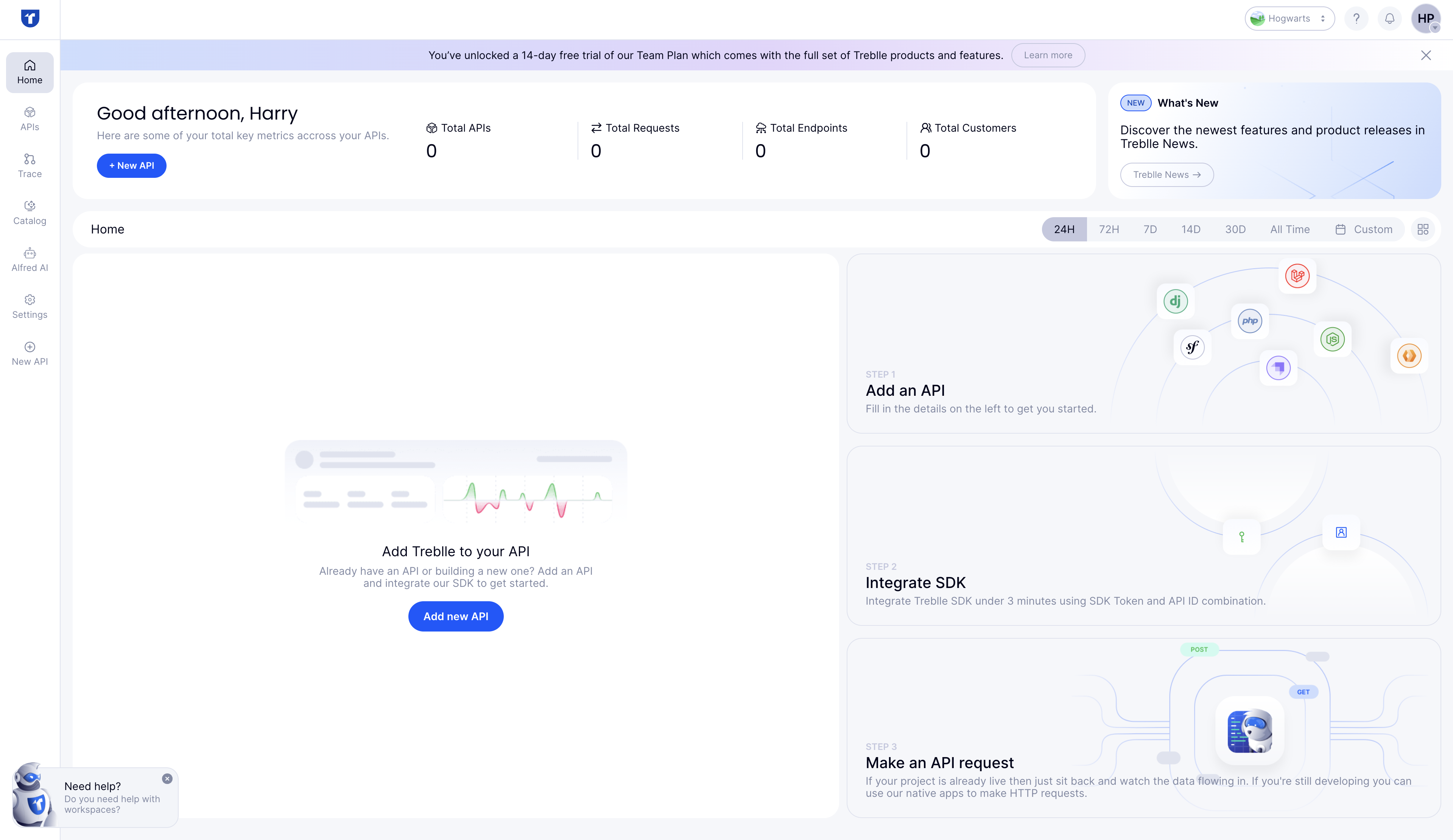The Treblle Homepage provides a bird’s-eye view of all your APIs and important metrics related to them. This is also where you can add new APIs.