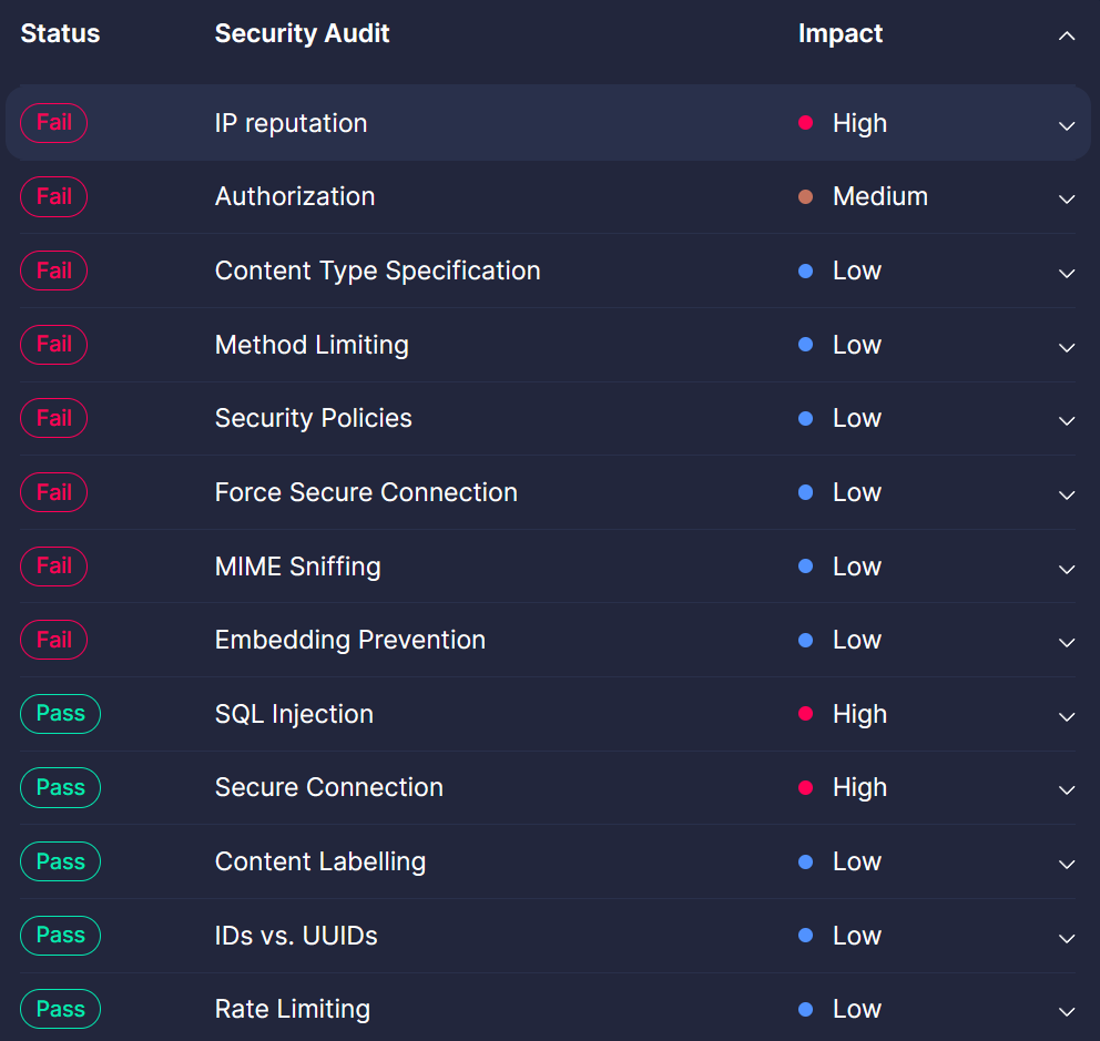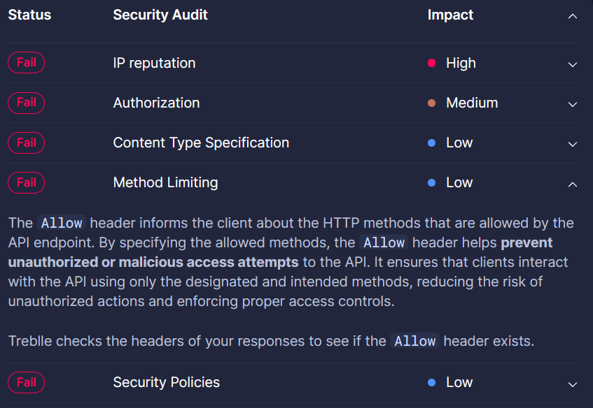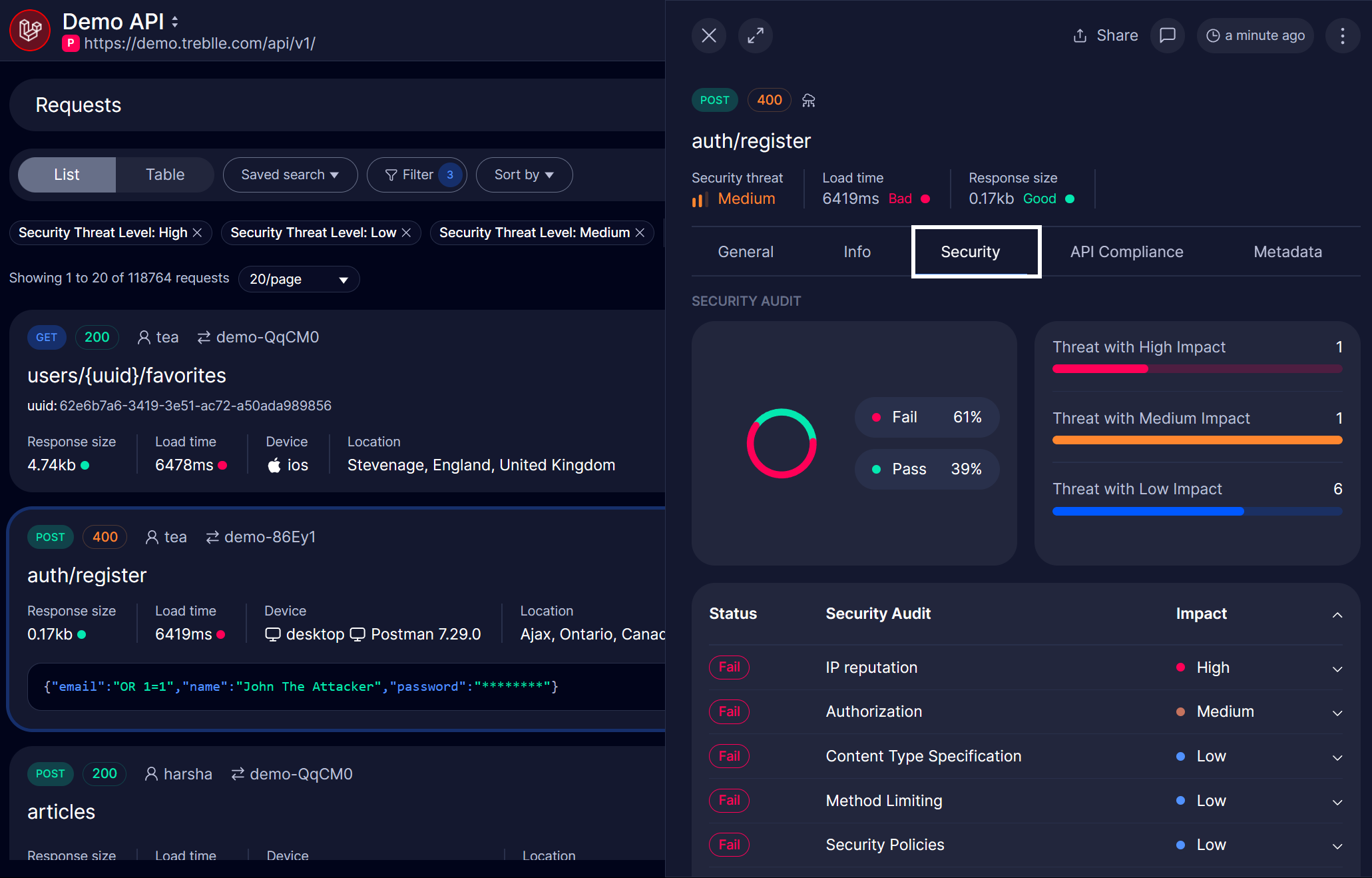 Treblle performs 13 automated security checks on every API request and assigns a Threat Level based on detected vulnerabilities.