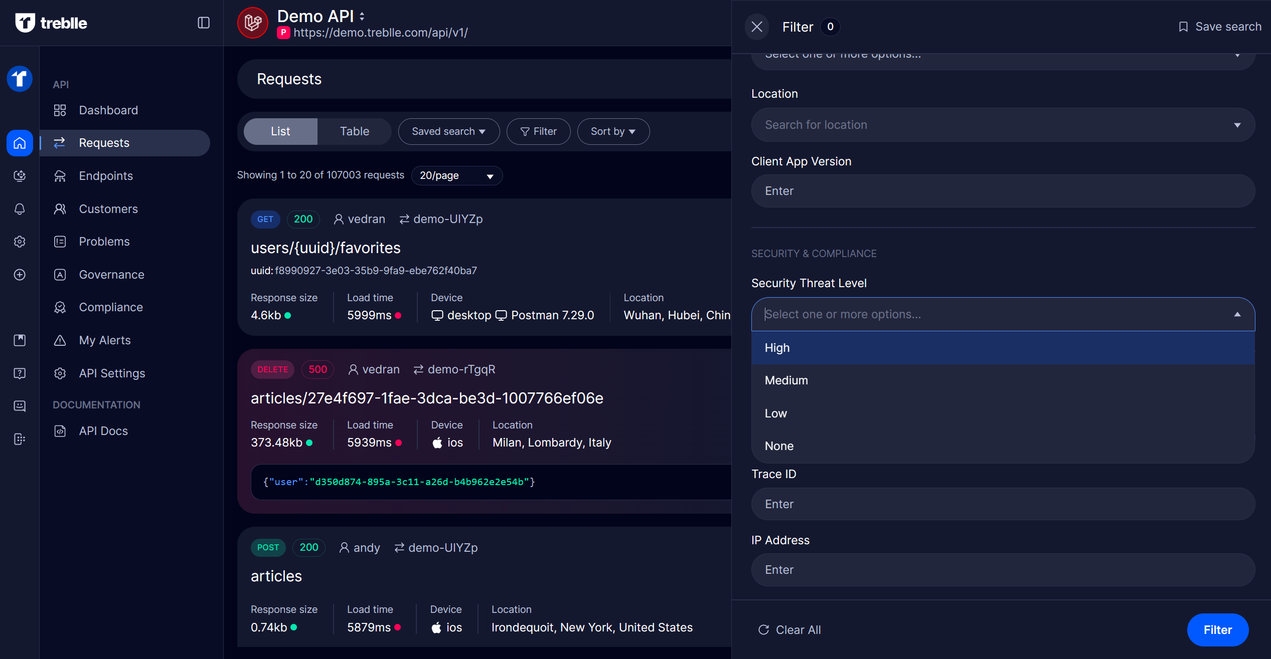 You can select a specific request or use filters to narrow down requests by Security Threat Level (Low, Medium, High).