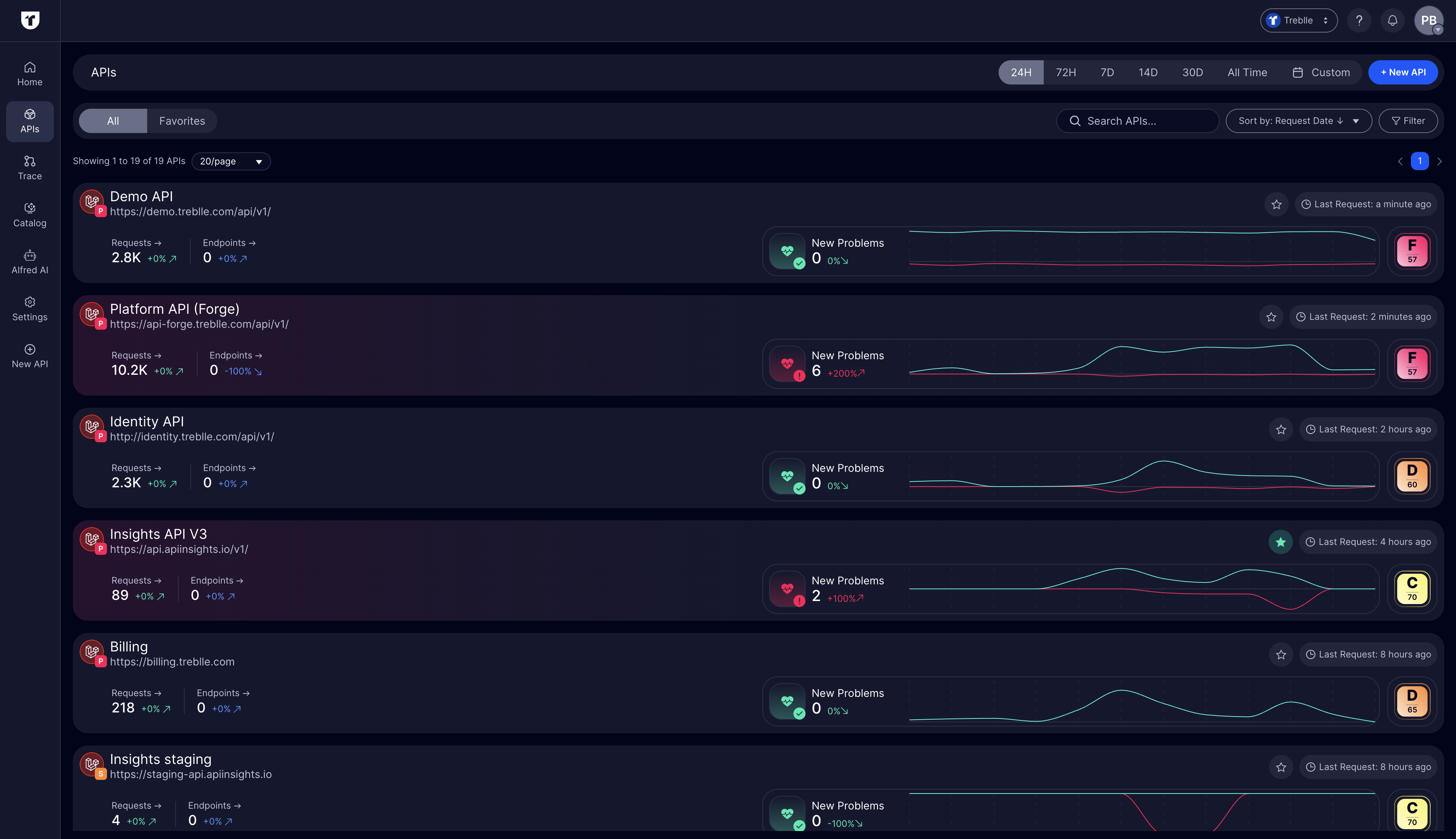 All APIs that you add to treblle in your workspace are displayed here. This view is the fastest way to catch up with the status of all your APIs. While the homepage is focused on giving you a high-level snapshot of all major metrics across the workspace, the API list view lets you dive into each API individually. Here you can see a detailed list of all your APIs, monitor their performance, and quickly search for the one you need.