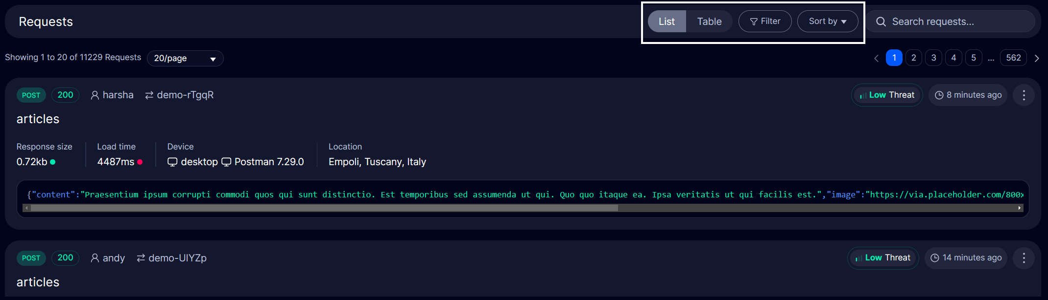- Sort requests using the SORT BY option ( Created at, Path, Threat level, Load time ).