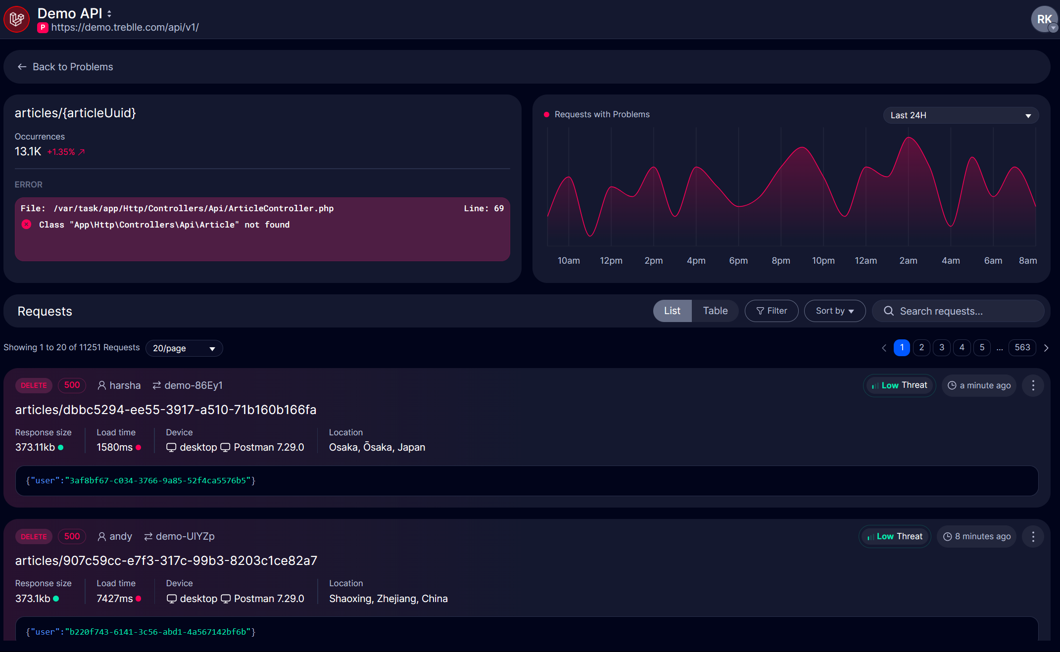 Treblle performs 15 security checks on every API request and assigns them under Low, Medium, and High threat levels.