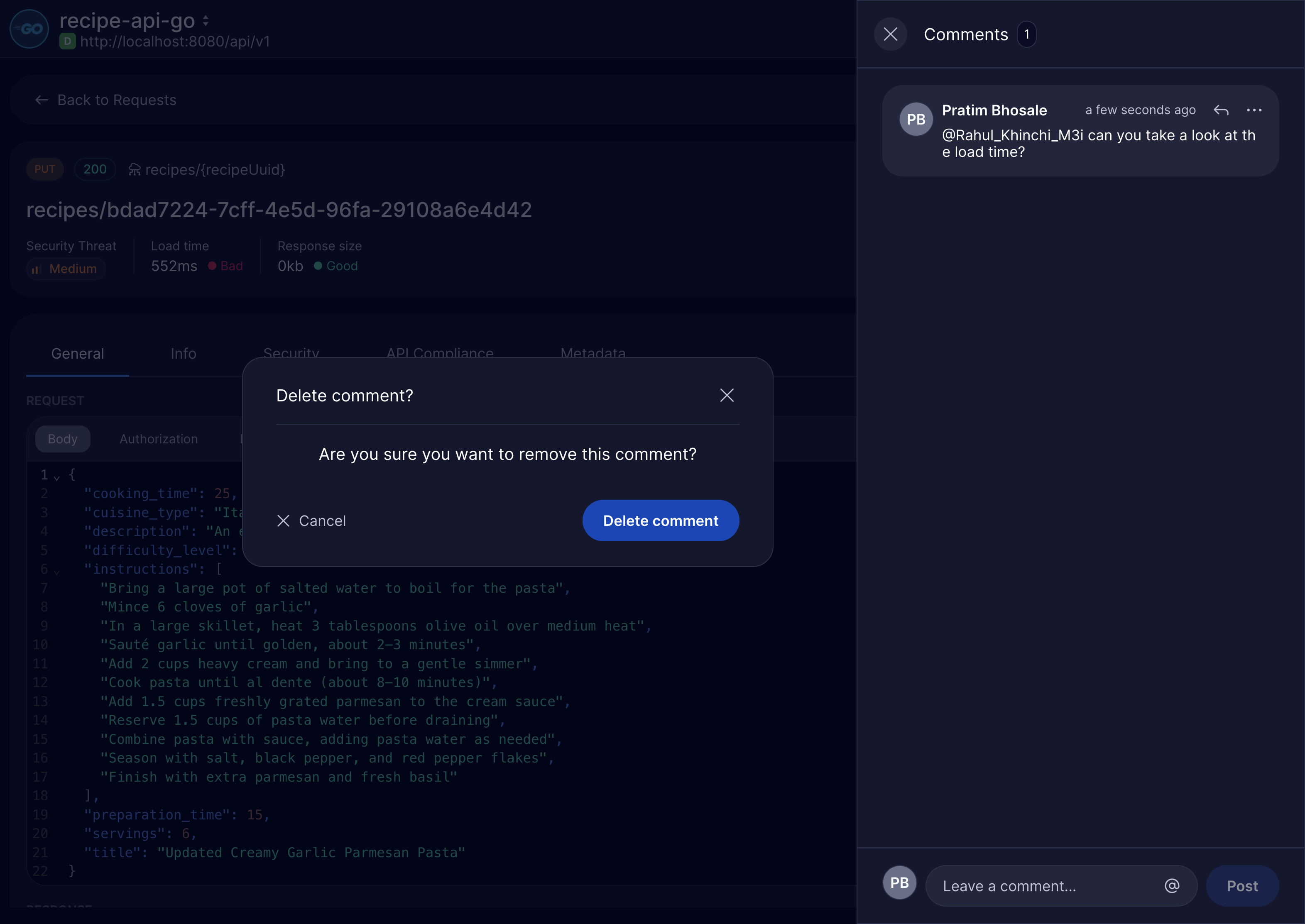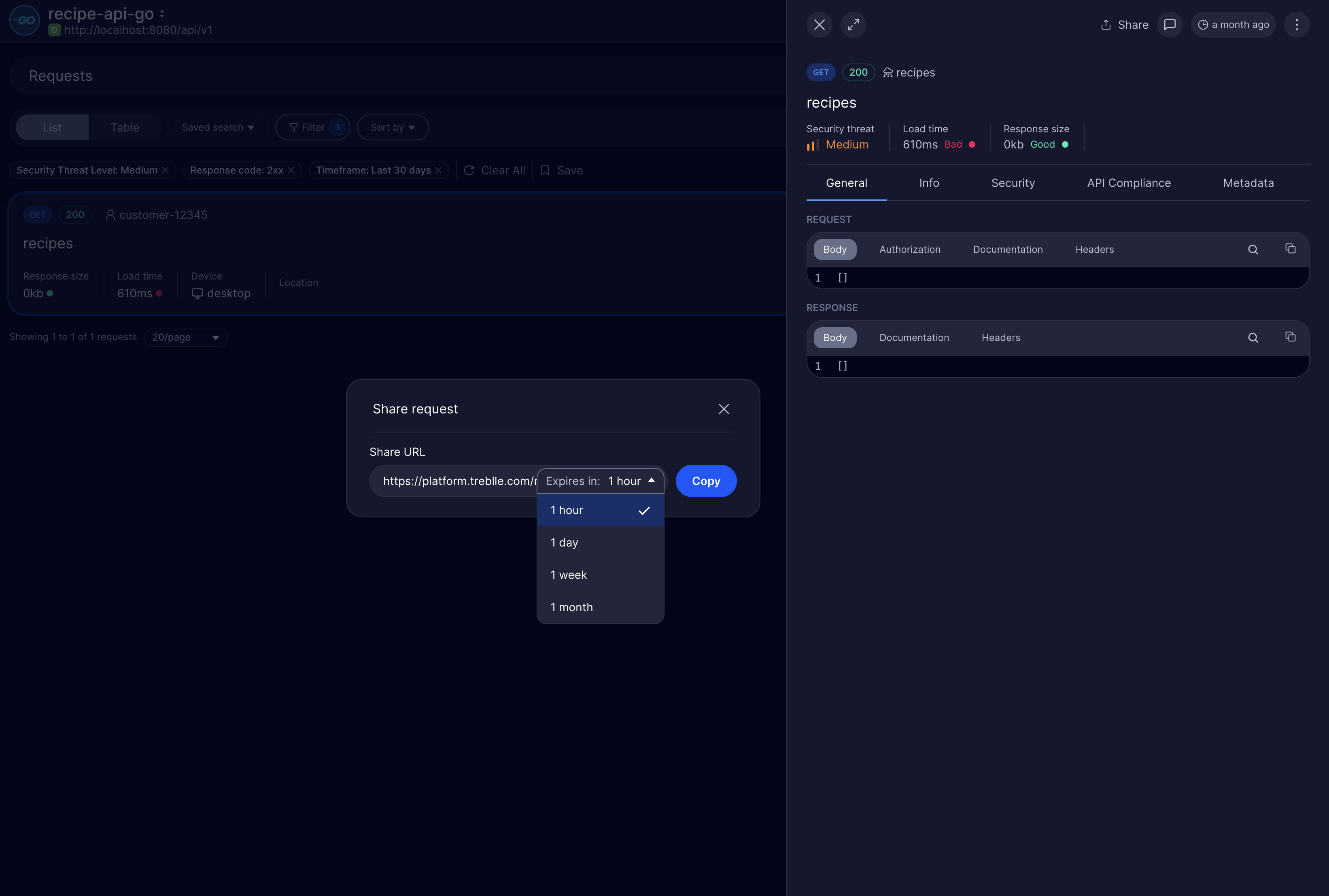 Section titled “Commenting and Sharing”Need to share a request with someone? Treblle allows you to share a request with your team members with an expiration date.