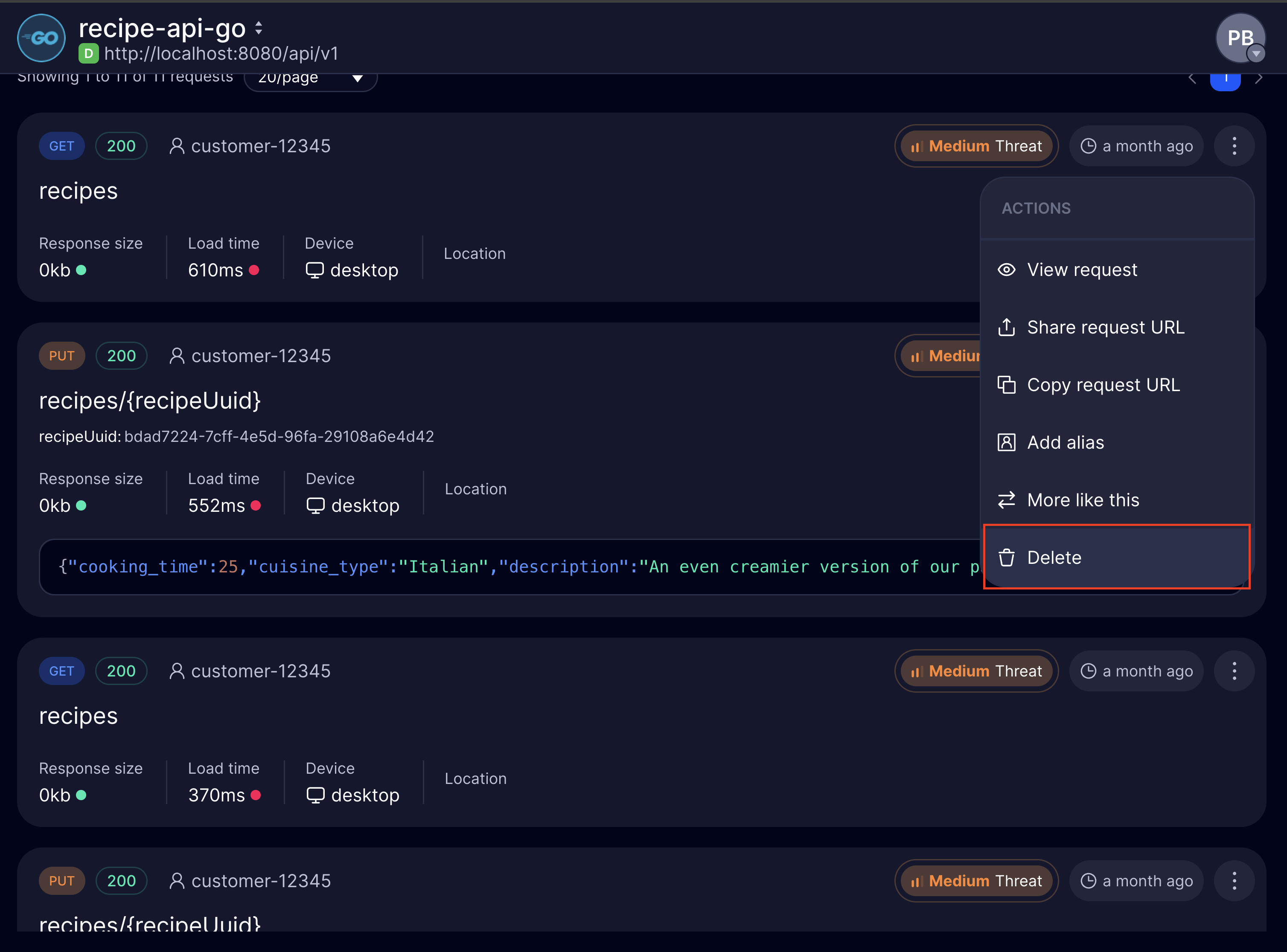 Section titled “Deleting Requests”If a request log is no longer needed, you can delete it by clicking on the three dots and selecting Delete: