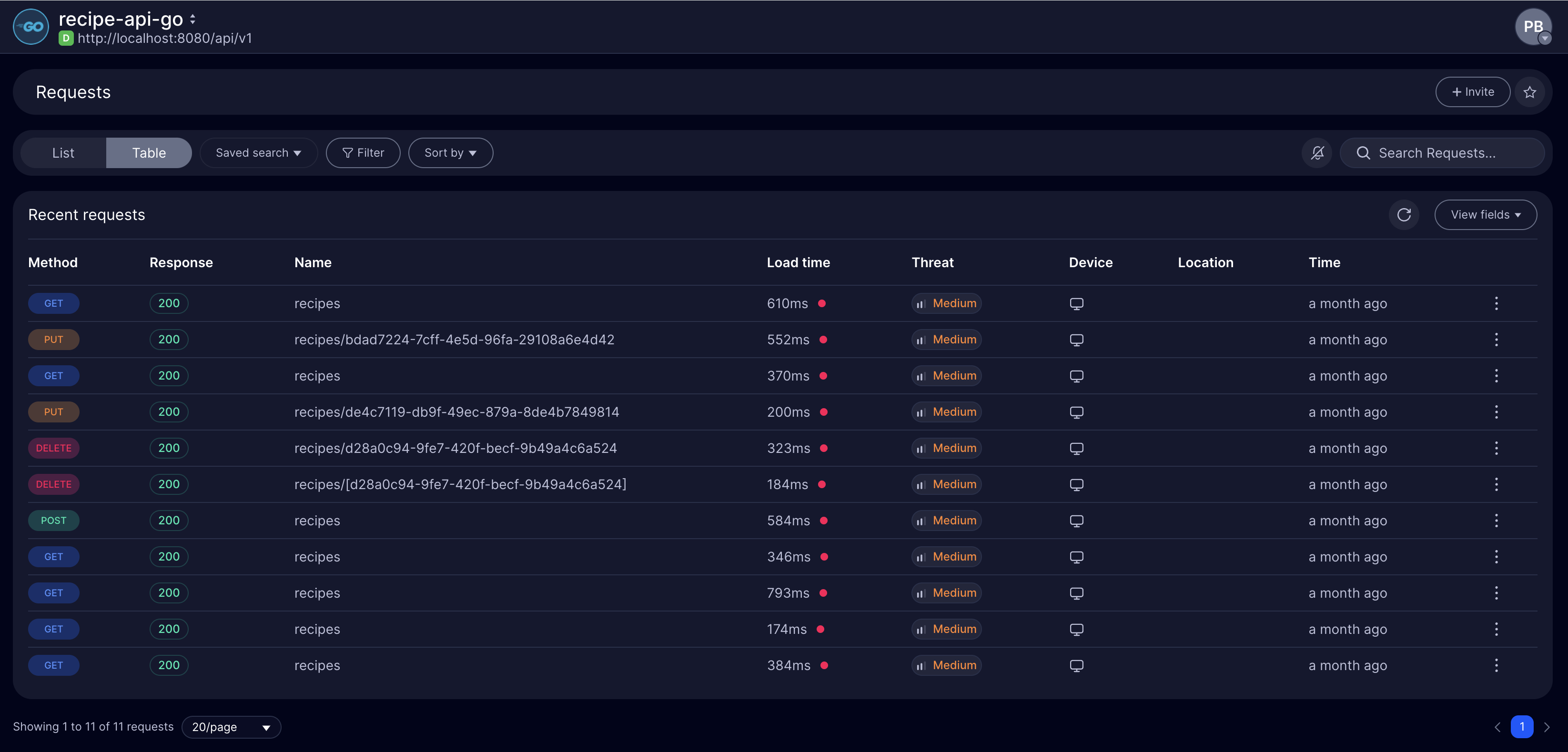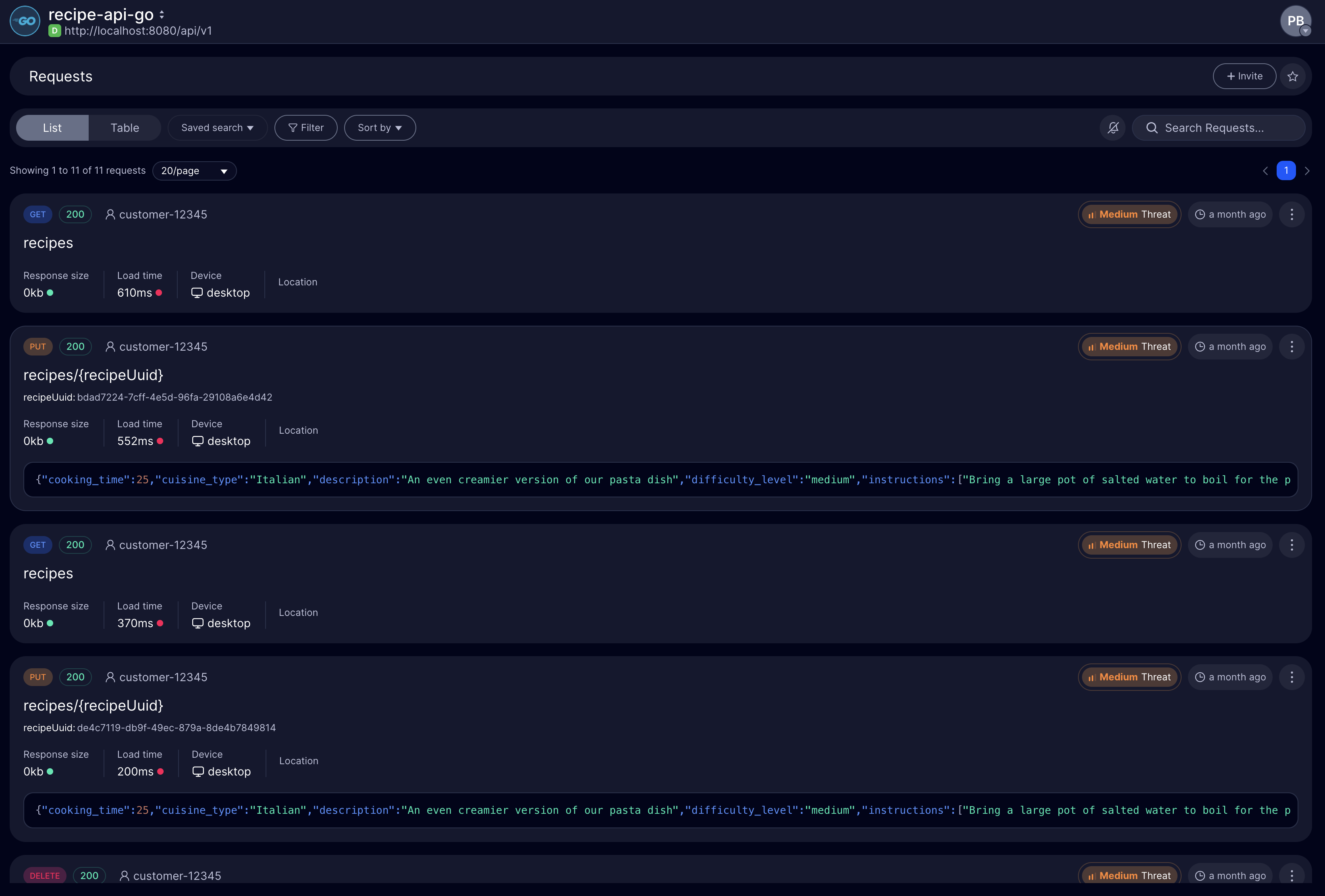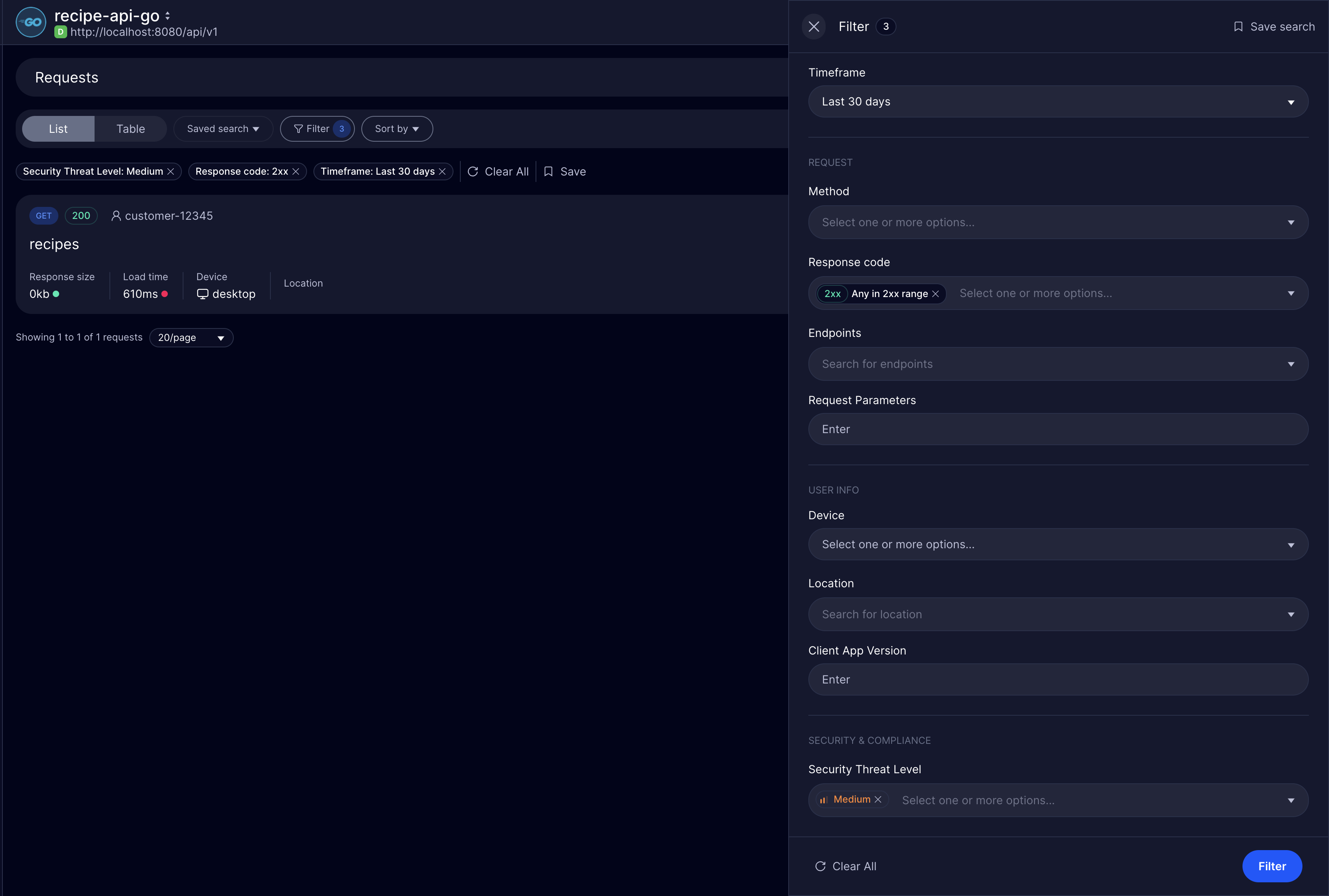 The Requests tab in your API Dashboard provides real-time visibility into your API’s activity. It visualizes the important metrics around your API requests, such as performance and security, and helps you debug issues faster.