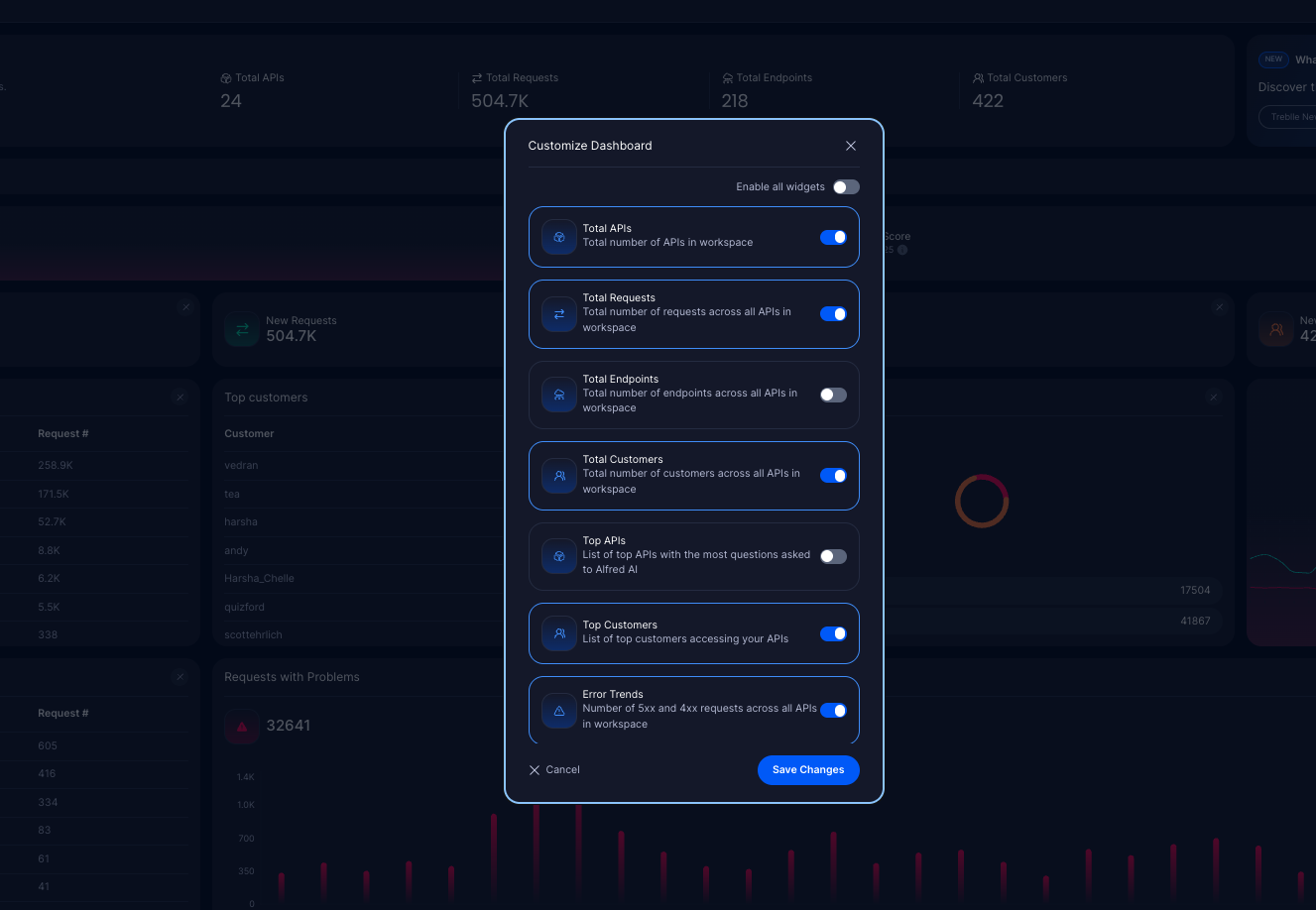 - Top APIs & Customers: Identify which APIs and customers drive the most traffic and engagement.
